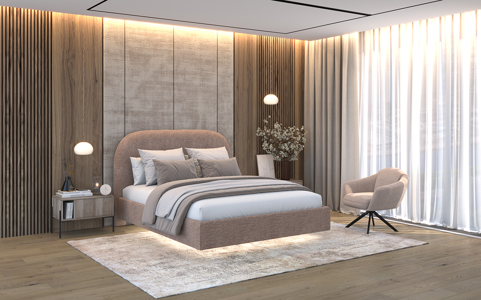 Кровать с изголовьем, но без изножья — современное решение для комфортного интерьера спальни.
