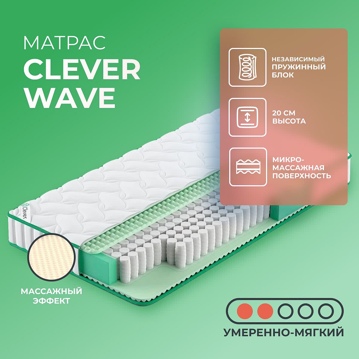 Средне-мягкий матрас «Clever Wave» просто создан для настоящего ценителя комфорта. Такая модель хорошо подходит людям с небольшим весом.