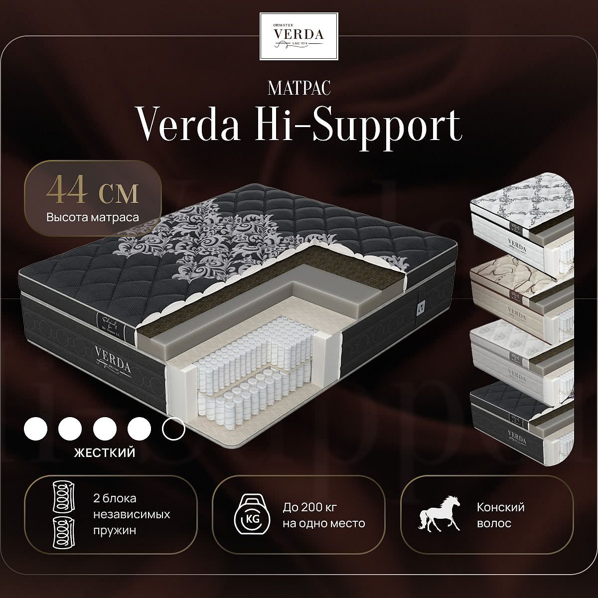 Односторонний матрас Verda Hi-Support - эксклюзивная модель класса «премиум» повышенной жесткости. В основе такого матраса лежит система High End, в которую входят два блока независимых пружин, обеспечивающих Вам комфортный отдых и сон. Помимо пружин здесь присутствуют слои конского волоса, придающие матрасу необходимую жесткость, а также два слоя инновационного материала selective foam.Состав матраса: